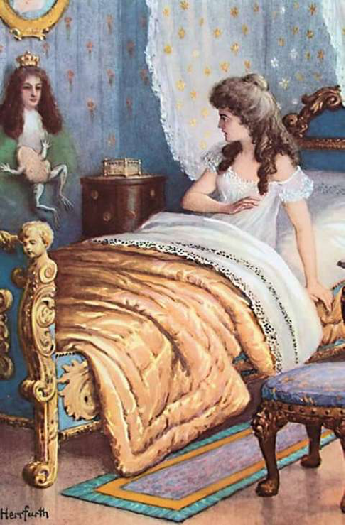So, comparing first version with last, we see how the Grimms’ opening tale in their collection, “The Frog King or Iron Heinrich”—likely from a story told in Kassel’s Wild family (Wilhelm married a woman from the family)—is an “animal-groom” story, about a creature bargaining for a place in the princess’s bed and marriage (“if you’ll love and cherish me”) to her: