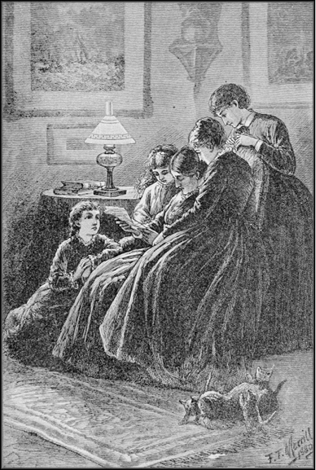 “They all drew to the fire, mother in the big chair, with Beth at her feet” (Drawing by Frank T. Merrill for the first illustrated edition [1880] of Little Women)