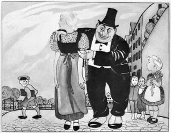 An anti-Semitic cartoon, by Philipp Rupprecht, depicting the Jew as corrupter of the innocent Aryan woman, from an interwar (c. 1920s) German schoolbook for children